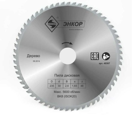 Диск пильный ф235х30 z48 дерево Энкор - режущий инструмент предназначенный для работы с древесиной. Полотно диска содержит компенсационные температурные прорези. Надежный твердосплавный пильный диск. Они выполняются из прочной инструментальной стали. Большой период работы от заточки до заточки.